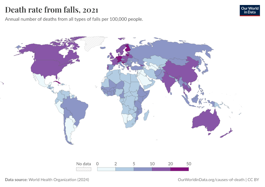 “Data Page: Death rate from falls”, part of the following publication: Esteban Ortiz-Ospina and Max Roser (2016) - “Global Health”. Data adapted from World Health Organization. Retrieved from https://sophia-test-2.owid.pages.dev/grapher/death-rate-from-falls [online resource]How to cite this data