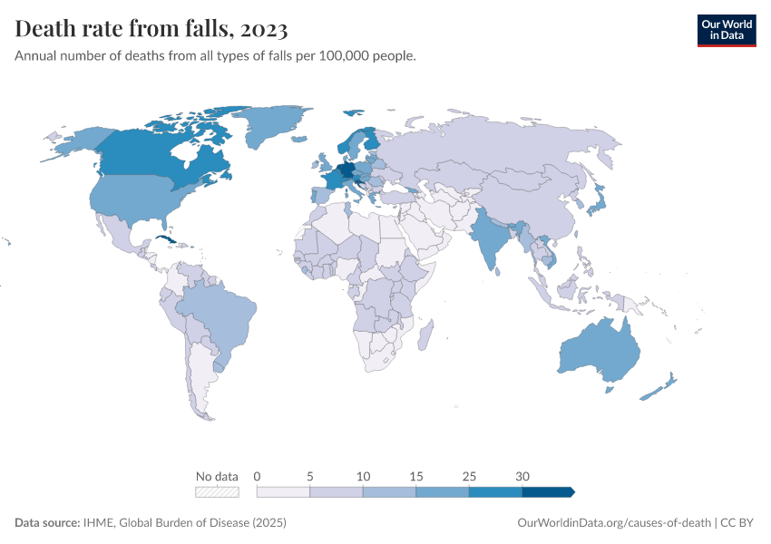 “Data Page: Death rate from falls”, part of the following publication: Esteban Ortiz-Ospina and Max Roser (2016) - “Global Health”. Data adapted from IHME, Global Burden of Disease. Retrieved from https://sophia-test-2.owid.pages.dev/grapher/death-rate-from-falls-gbd-rate [online resource]How to cite this data