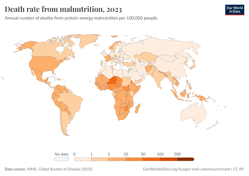 IHME, Global Burden of Disease (2024) – with minor processing by Our World in Data. “Death rate from malnutrition” [dataset]. IHME, Global Burden of Disease, “Global Burden of Disease - Deaths and DALYs” [original data]. Retrieved January 6, 2026 from https://sophia-test-2.owid.pages.dev/grapher/death-rate-from-malnutrition