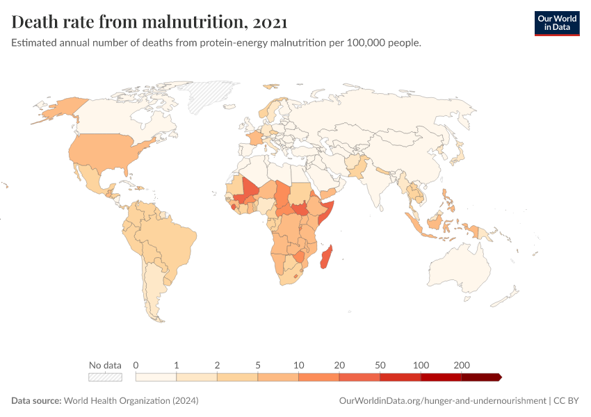 World Health Organization (2024) – with major processing by Our World in Data. “Death rate from malnutrition” [dataset]. World Health Organization, “Global Health Estimates” [original data]. Retrieved January 6, 2026 from https://sophia-test-2.owid.pages.dev/grapher/death-rate-from-malnutrition-ghe