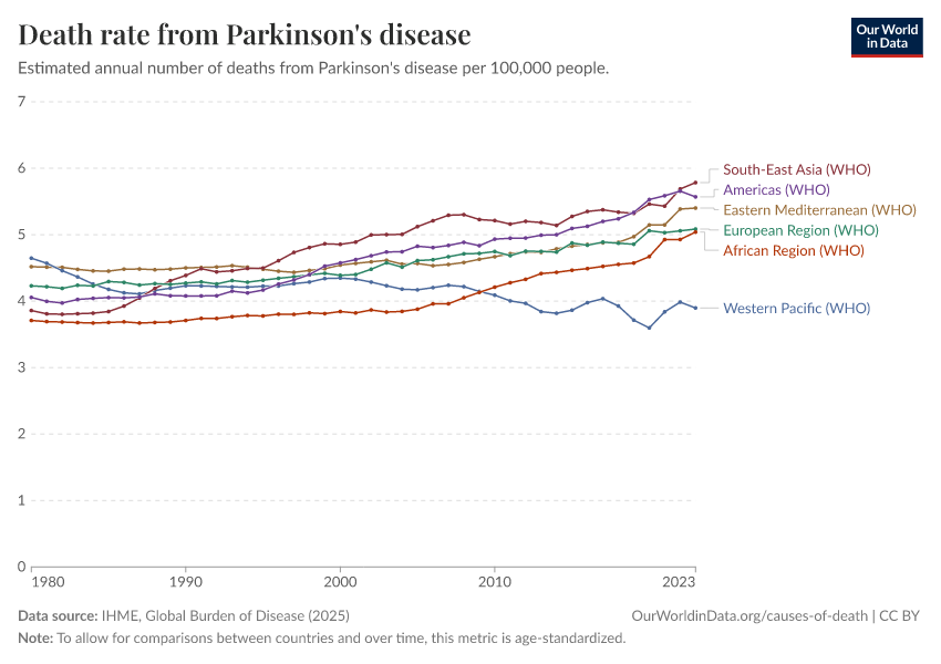 IHME, Global Burden of Disease (2024) – with minor processing by Our World in Data. “Death rate from Parkinson's disease” [dataset]. IHME, Global Burden of Disease, “Global Burden of Disease - Deaths and DALYs” [original data]. Retrieved January 6, 2026 from https://sophia-test-2.owid.pages.dev/grapher/death-rate-from-parkinsons-disease