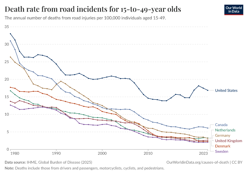 “Data Page: Death rate from road incidents for 15-to-49-year olds”, part of the following publication: Esteban Ortiz-Ospina and Max Roser (2016) - “Global Health”. Data adapted from IHME, Global Burden of Disease. Retrieved from https://sophia-test-2.owid.pages.dev/grapher/death-rate-from-road-accidents-for-15--to-49-year-olds [online resource]How to cite this data