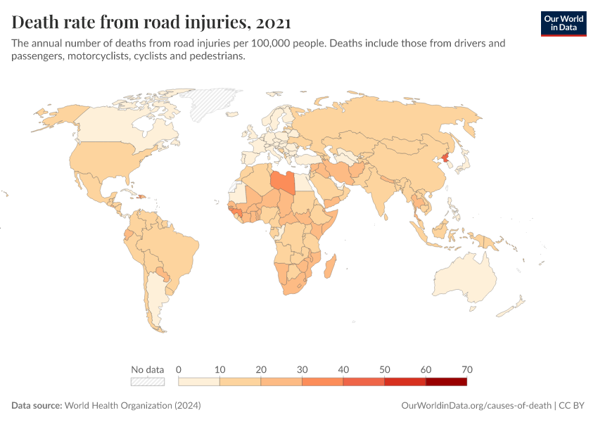 World Health Organization (2024) – with major processing by Our World in Data. “Death rate from road injuries” [dataset]. World Health Organization, “Global Health Estimates” [original data]. Retrieved January 6, 2026 from https://sophia-test-2.owid.pages.dev/grapher/death-rate-from-road-accidents-ghe
