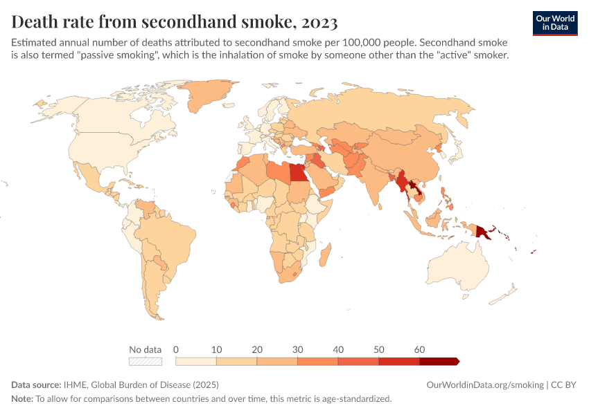 IHME, Global Burden of Disease (2024) – with minor processing by Our World in Data. “Death rate from secondhand smoke” [dataset]. IHME, Global Burden of Disease, “Global Burden of Disease - Risk Factors” [original data]. Retrieved January 6, 2026 from https://sophia-test-2.owid.pages.dev/grapher/death-rate-from-secondhand-smoke