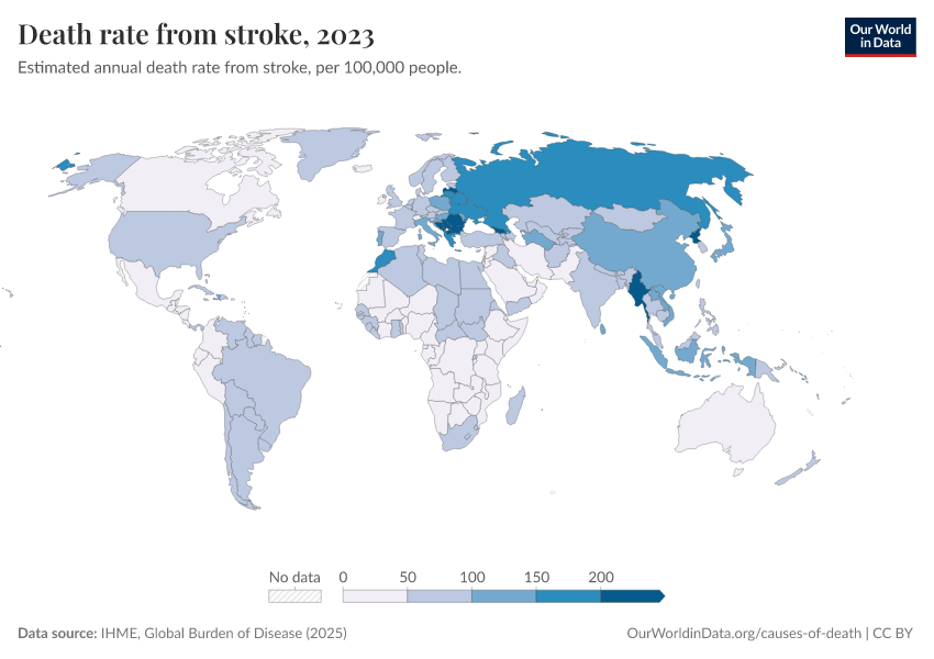 IHME, Global Burden of Disease (2024) – with minor processing by Our World in Data. “Death rate from stroke” [dataset]. IHME, Global Burden of Disease, “Global Burden of Disease - Deaths and DALYs” [original data]. Retrieved January 6, 2026 from https://sophia-test-2.owid.pages.dev/grapher/death-rate-from-strokes