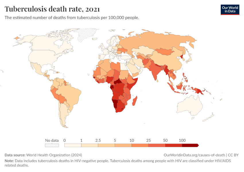 World Health Organization (2024) – with major processing by Our World in Data. “Tuberculosis death rate” [dataset]. World Health Organization, “Global Health Estimates” [original data]. Retrieved January 6, 2026 from https://sophia-test-2.owid.pages.dev/grapher/death-rate-from-tuberculosis-ghe