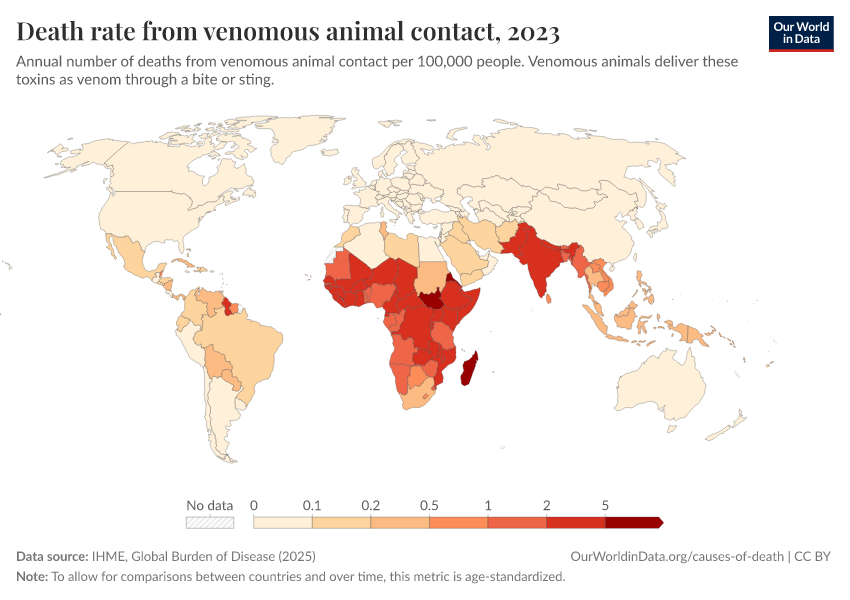 IHME, Global Burden of Disease (2024) – with minor processing by Our World in Data. “Death rate from venomous animal contact” [dataset]. IHME, Global Burden of Disease, “Global Burden of Disease - Deaths and DALYs” [original data]. Retrieved January 6, 2026 from https://sophia-test-2.owid.pages.dev/grapher/death-rate-from-venomous-animal