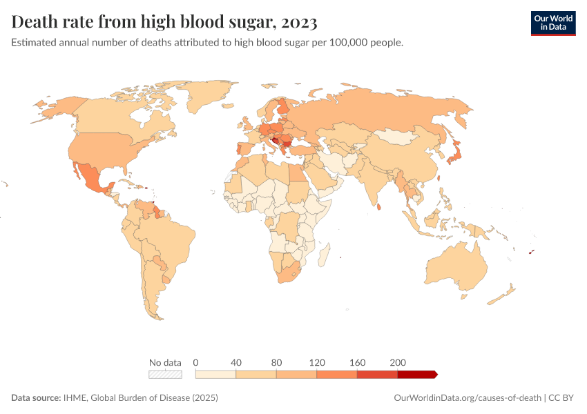 IHME, Global Burden of Disease (2024) – with minor processing by Our World in Data. “Death rate from high blood sugar” [dataset]. IHME, Global Burden of Disease, “Global Burden of Disease - Risk Factors” [original data]. Retrieved January 6, 2026 from https://sophia-test-2.owid.pages.dev/grapher/death-rates-from-high-blood-sugar-gbd