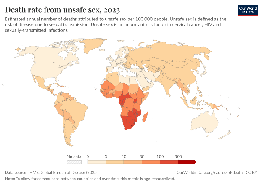 IHME, Global Burden of Disease (2024) – with minor processing by Our World in Data. “Death rate from unsafe sex” [dataset]. IHME, Global Burden of Disease, “Global Burden of Disease - Risk Factors” [original data]. Retrieved January 6, 2026 from https://sophia-test-2.owid.pages.dev/grapher/death-rates-from-unsafe-sex
