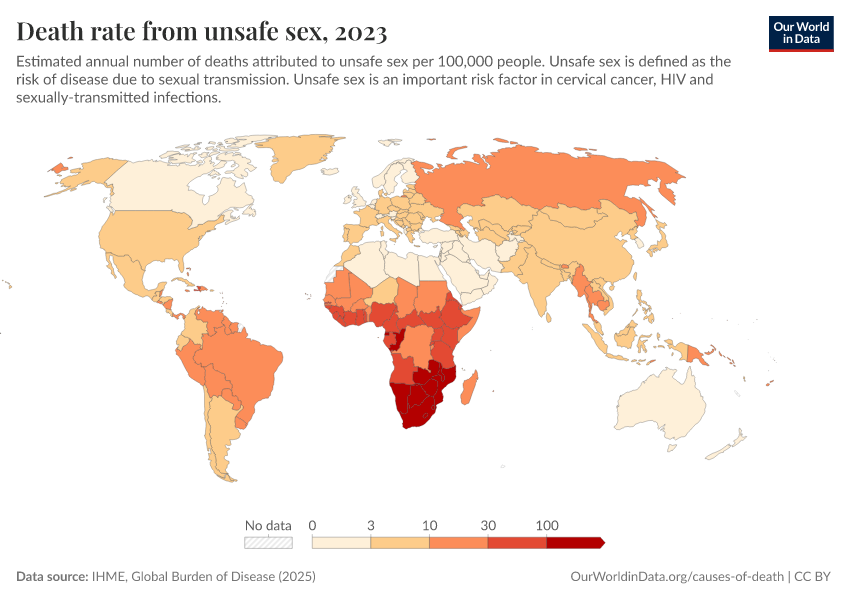 IHME, Global Burden of Disease (2024) – with minor processing by Our World in Data. “Death rate from unsafe sex” [dataset]. IHME, Global Burden of Disease, “Global Burden of Disease - Risk Factors” [original data]. Retrieved January 6, 2026 from https://sophia-test-2.owid.pages.dev/grapher/death-rates-from-unsafe-sex-gbd