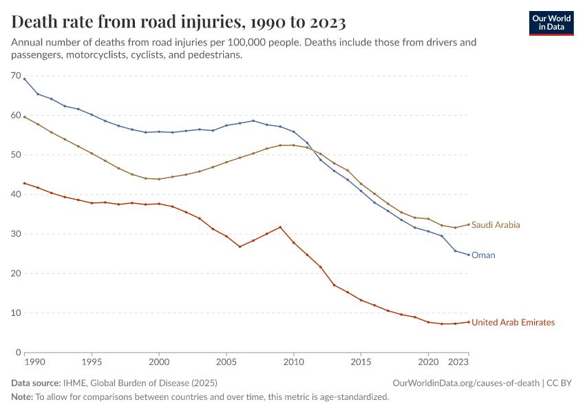 IHME, Global Burden of Disease (2024) – with minor processing by Our World in Data. “Death rate from road injuries” [dataset]. IHME, Global Burden of Disease, “Global Burden of Disease - Deaths and DALYs” [original data]. Retrieved January 6, 2026 from https://sophia-test-2.owid.pages.dev/grapher/death-rates-road-incidents