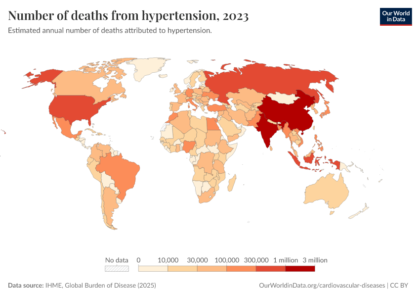 “Data Page: Number of deaths from hypertension”, part of the following publication: Esteban Ortiz-Ospina and Max Roser (2016) - “Global Health”. Data adapted from IHME, Global Burden of Disease. Retrieved from https://sophia-test-2.owid.pages.dev/grapher/deaths-due-to-high-blood-pressure [online resource]How to cite this data