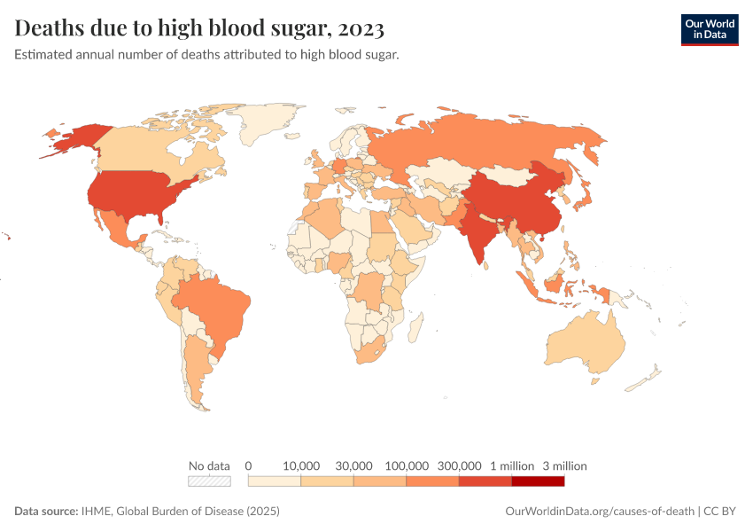 “Data Page: Deaths due to high blood sugar”, part of the following publication: Esteban Ortiz-Ospina and Max Roser (2016) - “Global Health”. Data adapted from IHME, Global Burden of Disease. Retrieved from https://sophia-test-2.owid.pages.dev/grapher/deaths-due-to-high-blood-sugar [online resource]How to cite this data
