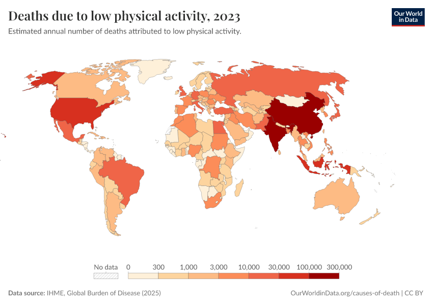“Data Page: Deaths due to low physical activity”, part of the following publication: Esteban Ortiz-Ospina and Max Roser (2016) - “Global Health”. Data adapted from IHME, Global Burden of Disease. Retrieved from https://sophia-test-2.owid.pages.dev/grapher/deaths-due-to-low-physical-activity [online resource]How to cite this data