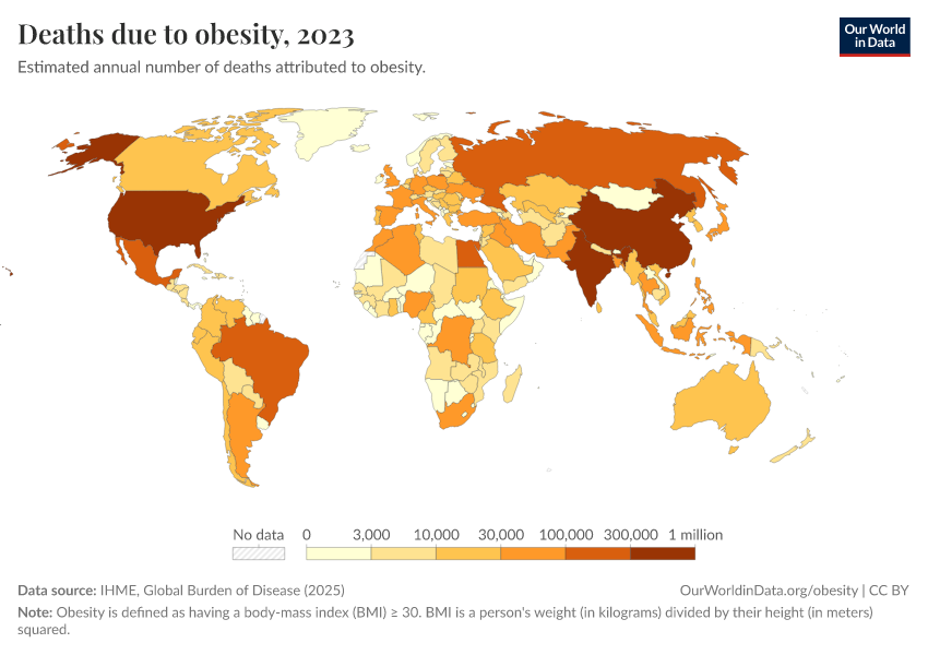 IHME, Global Burden of Disease (2024) – with minor processing by Our World in Data. “Deaths due to obesity” [dataset]. IHME, Global Burden of Disease, “Global Burden of Disease - Risk Factors” [original data]. Retrieved January 6, 2026 from https://sophia-test-2.owid.pages.dev/grapher/deaths-due-to-obesity