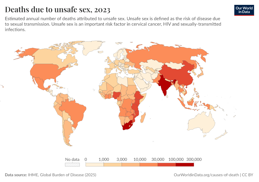 “Data Page: Deaths due to unsafe sex”, part of the following publication: Esteban Ortiz-Ospina and Max Roser (2016) - “Global Health”. Data adapted from IHME, Global Burden of Disease. Retrieved from https://sophia-test-2.owid.pages.dev/grapher/deaths-due-to-unsafe-sex [online resource]How to cite this data