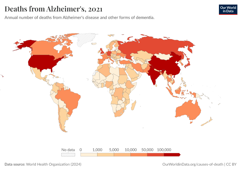 “Data Page: Deaths from Alzheimer's”, part of the following publication: Esteban Ortiz-Ospina and Max Roser (2016) - “Global Health”. Data adapted from World Health Organization. Retrieved from https://sophia-test-2.owid.pages.dev/grapher/deaths-from-alzheimers-other-dementias [online resource]How to cite this data