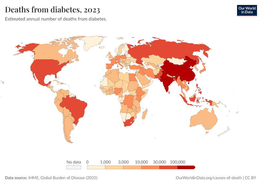 “Data Page: Deaths from diabetes”, part of the following publication: Esteban Ortiz-Ospina and Max Roser (2016) - “Global Health”. Data adapted from IHME, Global Burden of Disease. Retrieved from https://sophia-test-2.owid.pages.dev/grapher/deaths-from-diabetes [online resource]How to cite this data
