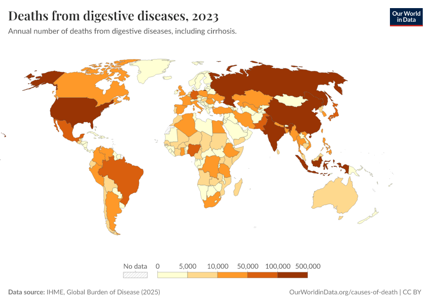 “Data Page: Deaths from digestive diseases”, part of the following publication: Esteban Ortiz-Ospina and Max Roser (2016) - “Global Health”. Data adapted from IHME, Global Burden of Disease. Retrieved from https://sophia-test-2.owid.pages.dev/grapher/deaths-from-digestive-diseases [online resource]How to cite this data