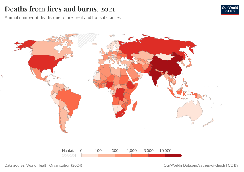 “Data Page: Deaths from fires and burns”, part of the following publication: Esteban Ortiz-Ospina and Max Roser (2016) - “Global Health”. Data adapted from World Health Organization. Retrieved from https://sophia-test-2.owid.pages.dev/grapher/deaths-from-fires-and-burns-who [online resource]How to cite this data