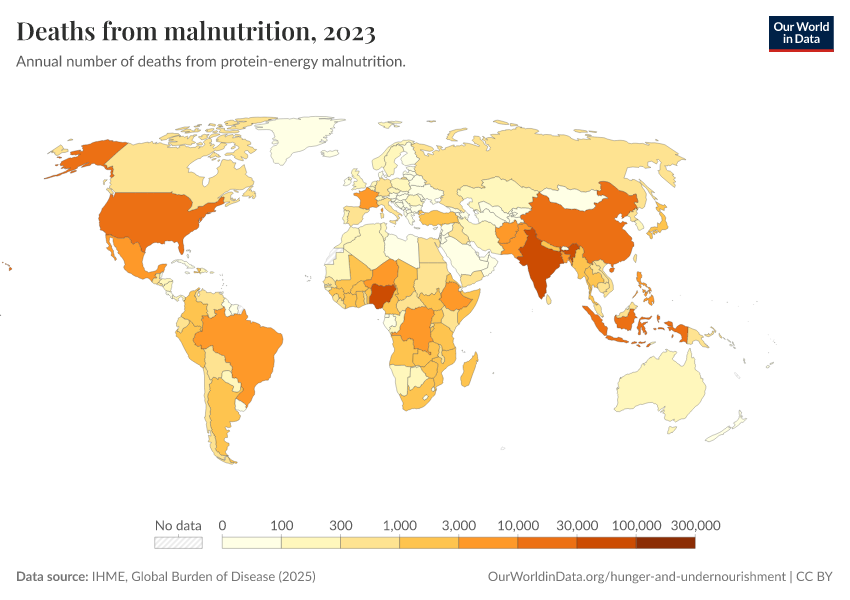 IHME, Global Burden of Disease (2024) – with minor processing by Our World in Data. “Deaths from malnutrition” [dataset]. IHME, Global Burden of Disease, “Global Burden of Disease - Deaths and DALYs” [original data]. Retrieved January 6, 2026 from https://sophia-test-2.owid.pages.dev/grapher/deaths-from-malnutrition