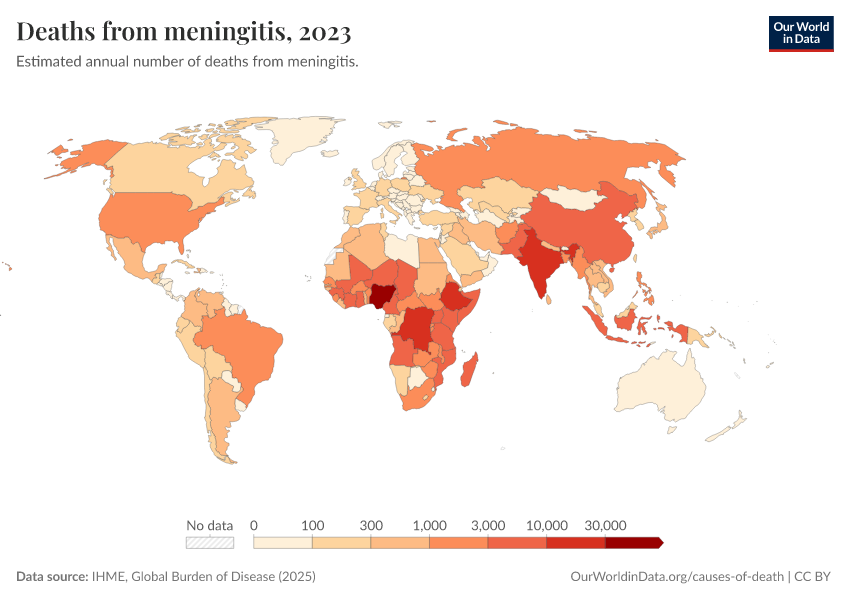“Data Page: Deaths from meningitis”, part of the following publication: Esteban Ortiz-Ospina and Max Roser (2016) - “Global Health”. Data adapted from IHME, Global Burden of Disease. Retrieved from https://sophia-test-2.owid.pages.dev/grapher/deaths-from-meningitis [online resource]How to cite this data