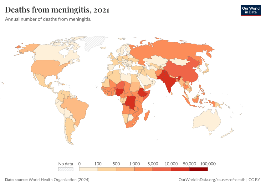 “Data Page: Deaths from meningitis”, part of the following publication: Esteban Ortiz-Ospina and Max Roser (2016) - “Global Health”. Data adapted from World Health Organization. Retrieved from https://sophia-test-2.owid.pages.dev/grapher/deaths-from-meningitis-ghe [online resource]How to cite this data