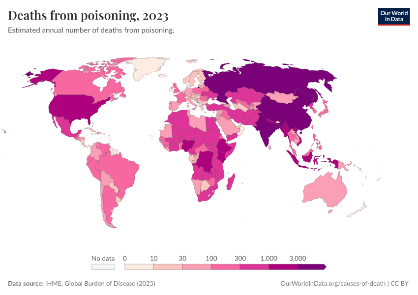 IHME, Global Burden of Disease (2024) – with minor processing by Our World in Data. “Deaths from poisoning” [dataset]. IHME, Global Burden of Disease, “Global Burden of Disease - Deaths and DALYs” [original data]. Retrieved January 6, 2026 from https://sophia-test-2.owid.pages.dev/grapher/deaths-from-poisoning