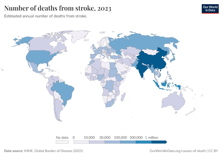 IHME, Global Burden of Disease (2024) – with minor processing by Our World in Data. “Number of deaths from stroke” [dataset]. IHME, Global Burden of Disease, “Global Burden of Disease - Deaths and DALYs” [original data]. Retrieved January 6, 2026 from https://sophia-test-2.owid.pages.dev/grapher/deaths-from-strokes