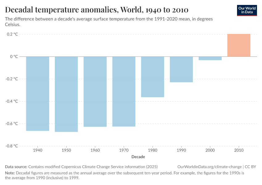 Contains modified Copernicus Climate Change Service information (2025) – with major processing by Our World in Data. “Decadal temperature anomalies” [dataset]. Contains modified Copernicus Climate Change Service information, “ERA5 monthly averaged data on single levels from 1940 to present 2” [original data]. Retrieved January 6, 2026 from https://sophia-test-2.owid.pages.dev/grapher/decadal-temperature-anomaly