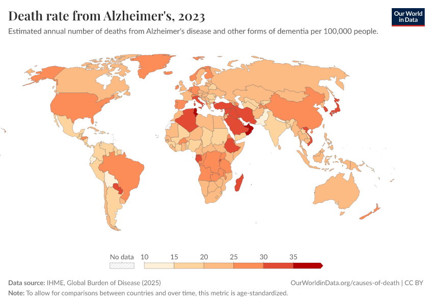 IHME, Global Burden of Disease (2024) – with minor processing by Our World in Data. “Death rate from Alzheimer's” [dataset]. IHME, Global Burden of Disease, “Global Burden of Disease - Deaths and DALYs” [original data]. Retrieved January 6, 2026 from https://sophia-test-2.owid.pages.dev/grapher/dementia-death-rates