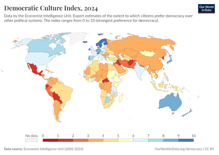 Economist Intelligence Unit (2006-2024) – processed by Our World in Data. “Democratic Culture Index” [dataset]. Economist Intelligence Unit, “Democracy Index 2021: The China challenge”; Economist Intelligence Unit, “Democracy Index 2022: Frontline democracy and the battle for Ukraine”; Economist Intelligence Unit, “Democracy Index 2023: Age of Conflict”; Economist Intelligence Unit, “Democracy Index 2024: What's wrong with representative democracy?”; Gapminder, “Democracy Index v4”; Various sources, “Population” [original data]. Retrieved January 6, 2026 from https://sophia-test-2.owid.pages.dev/grapher/democratic-culture-index-eiu