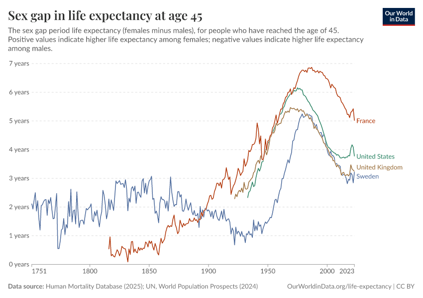 Human Mortality Database (2025); UN, World Population Prospects (2024) – with major processing by Our World in Data. “Life expectancy at 45 – HMD – female-male difference, period tables” [dataset]. Human Mortality Database, “Human Mortality Database”; United Nations, “World Population Prospects” [original data]. Retrieved January 6, 2026 from https://sophia-test-2.owid.pages.dev/grapher/difference-in-female-and-male-life-expectancy-at-age-45