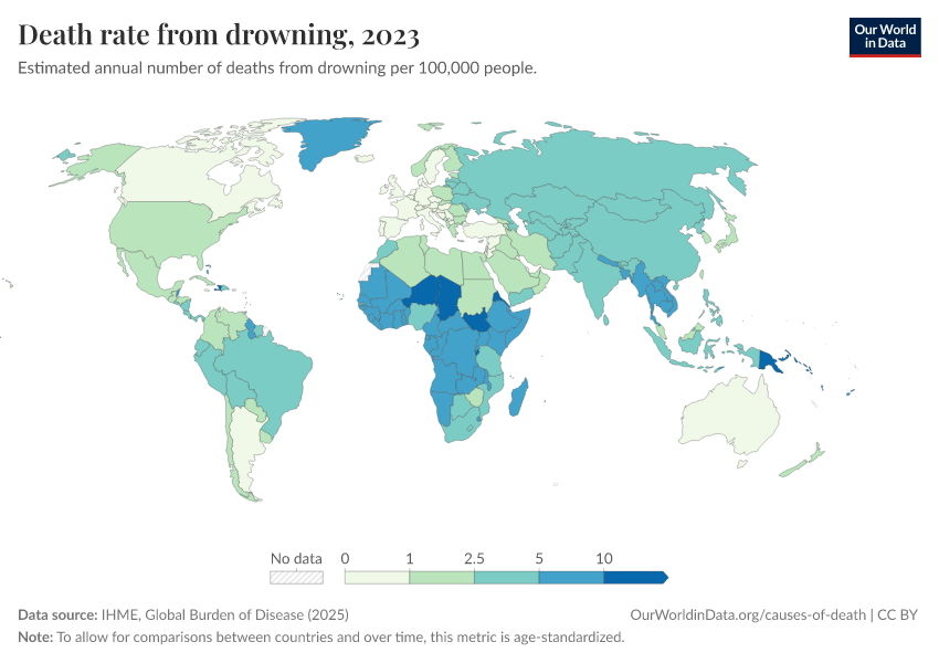 IHME, Global Burden of Disease (2024) – with minor processing by Our World in Data. “Death rate from drowning” [dataset]. IHME, Global Burden of Disease, “Global Burden of Disease - Deaths and DALYs” [original data]. Retrieved January 6, 2026 from https://sophia-test-2.owid.pages.dev/grapher/drowning-death-rates