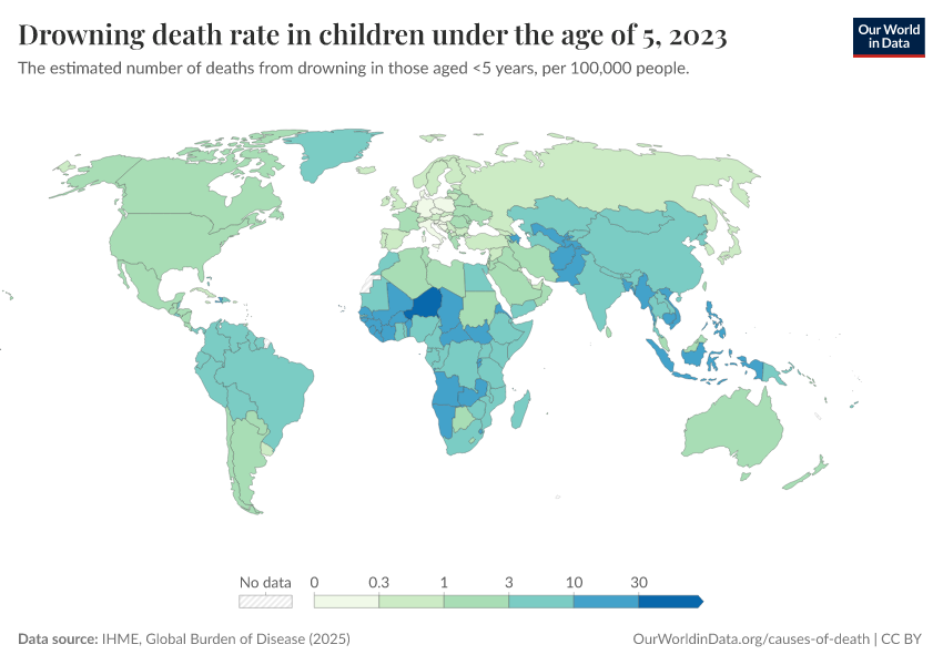 IHME, Global Burden of Disease (2024) – with minor processing by Our World in Data. “Drowning death rate in children under the age of 5” [dataset]. IHME, Global Burden of Disease, “Global Burden of Disease - Deaths and DALYs” [original data]. Retrieved January 6, 2026 from https://sophia-test-2.owid.pages.dev/grapher/drowning-death-rates-under-5