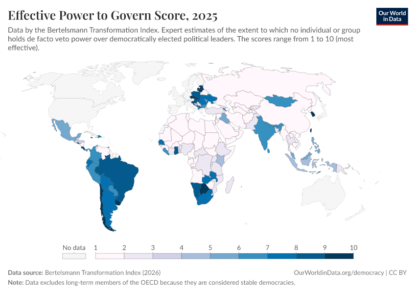 “Data Page: Effective power to govern score”, part of the following publication: Bastian Herre, Lucas Rodés-Guirao, and Esteban Ortiz-Ospina (2013) - “Democracy”. Data adapted from Bertelsmann Transformation Index. Retrieved from https://sophia-test-2.owid.pages.dev/grapher/effective-power-to-govern-score-bti [online resource]How to cite this data