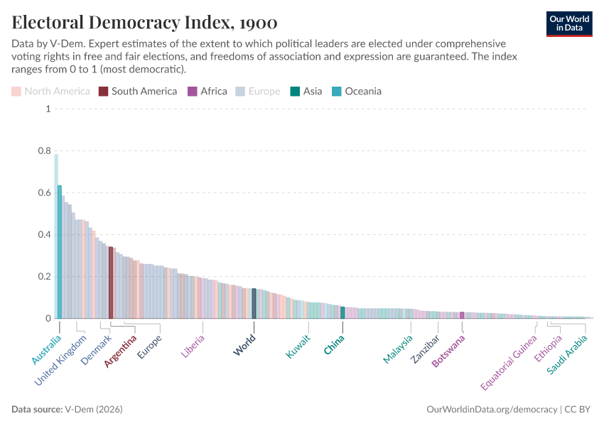 “Data Page: Electoral democracy index”, part of the following publication: Bastian Herre, Lucas Rodés-Guirao, and Esteban Ortiz-Ospina (2013) - “Democracy”. Data adapted from V-Dem. Retrieved from https://sophia-test-2.owid.pages.dev/grapher/electoral-democracy-index [online resource]How to cite this data