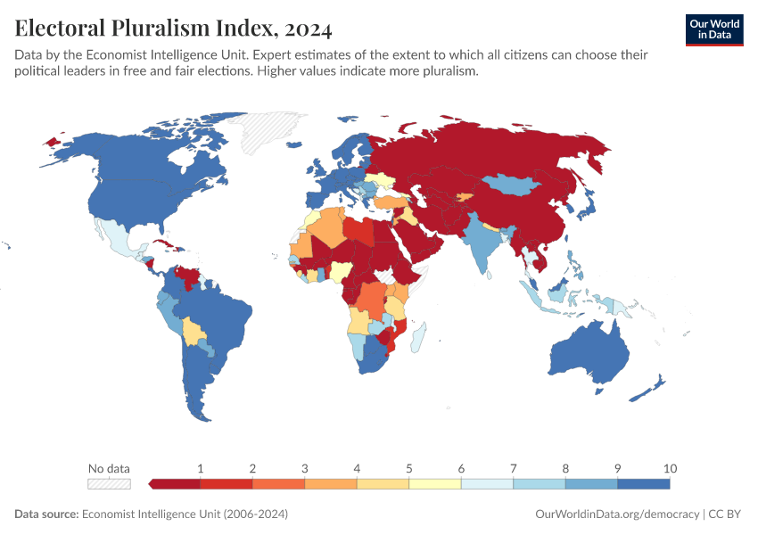 Economist Intelligence Unit (2006-2024) – processed by Our World in Data. “Electoral Pluralism Index” [dataset]. Economist Intelligence Unit, “Democracy Index 2021: The China challenge”; Economist Intelligence Unit, “Democracy Index 2022: Frontline democracy and the battle for Ukraine”; Economist Intelligence Unit, “Democracy Index 2023: Age of Conflict”; Economist Intelligence Unit, “Democracy Index 2024: What's wrong with representative democracy?”; Gapminder, “Democracy Index v4”; Various sources, “Population” [original data]. Retrieved January 6, 2026 from https://sophia-test-2.owid.pages.dev/grapher/electoral-pluralism-index-eiu
