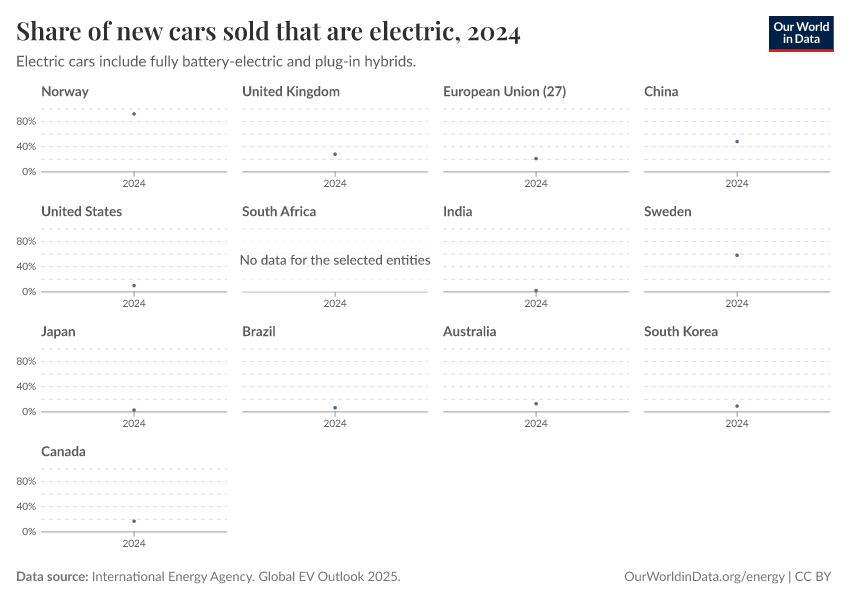 “Data Page: Share of new cars sold that are electric”. Our World in Data (2026). Data adapted from International Energy Agency. Global EV Outlook 2025.. Retrieved from https://sophia-test-2.owid.pages.dev/grapher/electric-car-sales-share [online resource]How to cite this data