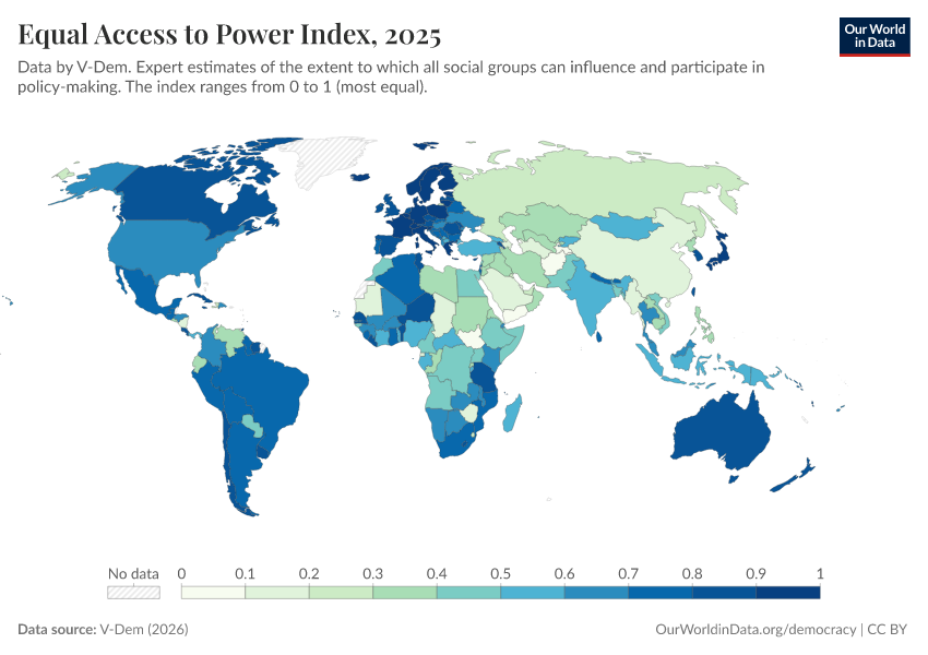 “Data Page: Equal access to power index”, part of the following publication: Bastian Herre, Lucas Rodés-Guirao, and Esteban Ortiz-Ospina (2013) - “Democracy”. Data adapted from V-Dem. Retrieved from https://sophia-test-2.owid.pages.dev/grapher/equal-access-to-power-index [online resource]How to cite this data
