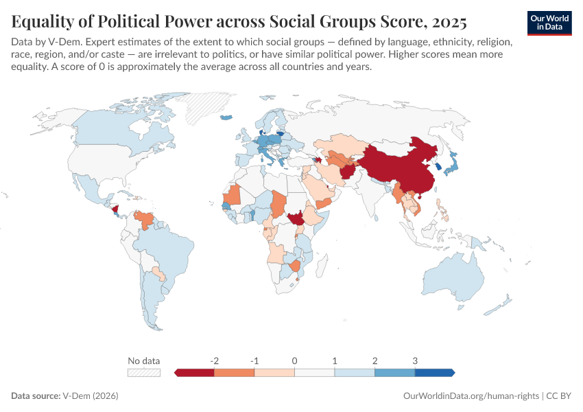 “Data Page: Equality of political power across social groups”, part of the following publication: Bastian Herre, Lucas Rodés-Guirao, and Esteban Ortiz-Ospina (2013) - “Democracy”. Data adapted from V-Dem. Retrieved from https://sophia-test-2.owid.pages.dev/grapher/equality-of-political-power-across-social-groups-score [online resource]How to cite this data