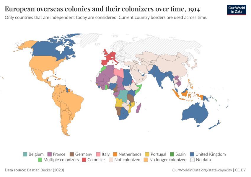 “Data Page: European overseas colonies and their colonizers over time”, part of the following publication: Bastian Herre and Pablo Arriagada (2023) - “State Capacity”. Data adapted from Bastian Becker. Retrieved from https://sophia-test-2.owid.pages.dev/grapher/european-overseas-colonies-and-their-colonizers [online resource]How to cite this data