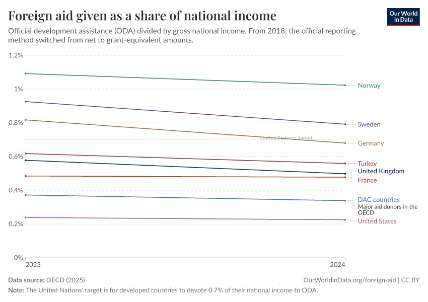 OECD (2025) – with minor processing by Our World in Data. “Foreign aid given as a share of national income – Official estimate” [dataset]. OECD, “OECD Official Development Assistance (ODA) - DAC1: Flows by provider (ODA+OOF+Private)” [original data]. Retrieved January 6, 2026 from https://sophia-test-2.owid.pages.dev/grapher/foreign-aid-given-as-a-share-of-national-income