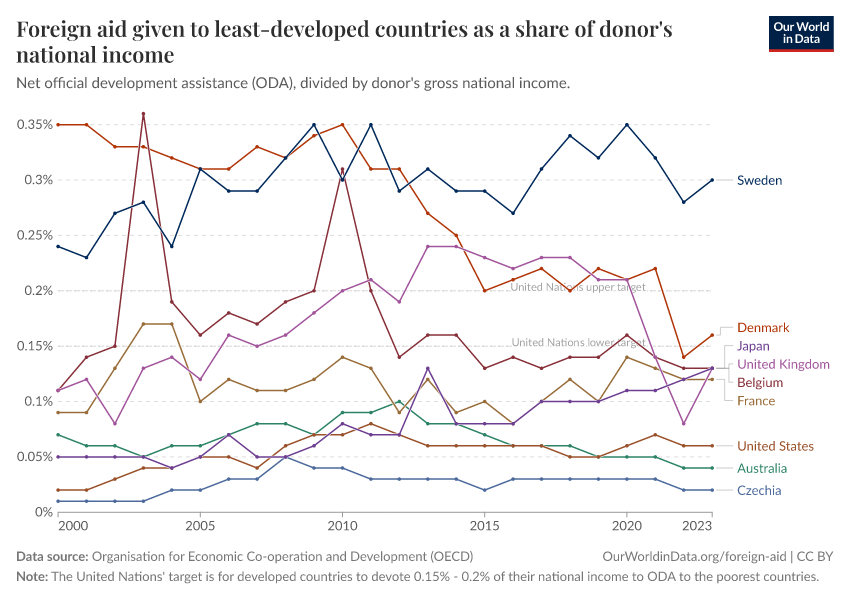 “Data Page: Foreign aid given to least-developed countries as a share of donor's national income”. Our World in Data (2026). Data adapted from Organisation for Economic Co-operation and Development. Retrieved from https://sophia-test-2.owid.pages.dev/grapher/foreign-aid-given-to-least-developed-countries-as-a-share-of-donors-national-income [online resource]How to cite this data