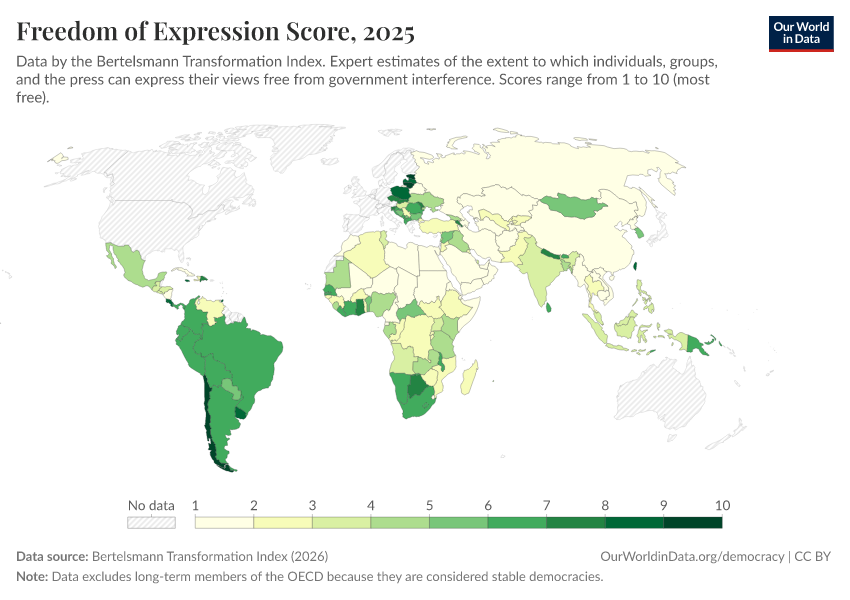 “Data Page: Freedom of expression score”, part of the following publication: Bastian Herre, Lucas Rodés-Guirao, and Esteban Ortiz-Ospina (2013) - “Democracy”. Data adapted from Bertelsmann Transformation Index. Retrieved from https://sophia-test-2.owid.pages.dev/grapher/freedom-of-expression-score-bti [online resource]How to cite this data