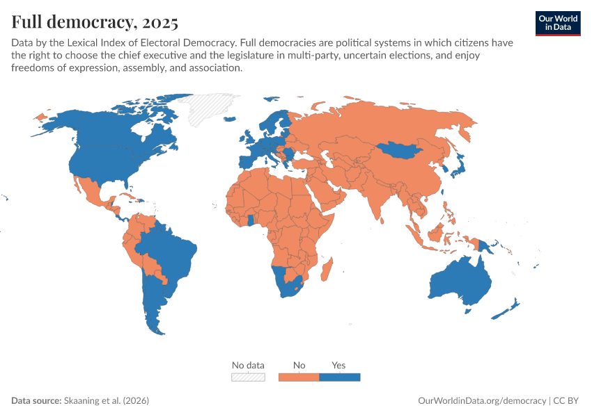 Skaaning et al. (2025) – processed by Our World in Data. “Full democracy” [dataset]. Skaaning et al., “Lexical Index of Electoral Democracy (LIED) v6.8” [original data]. Retrieved January 6, 2026 from https://sophia-test-2.owid.pages.dev/grapher/full-democracy-lexical