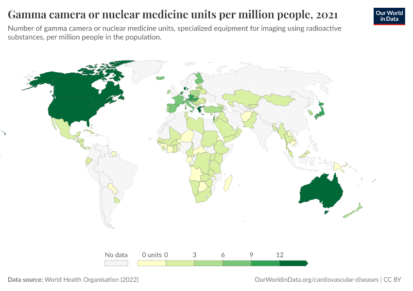 “Data Page: Gamma camera or nuclear medicine units per million people”, part of the following publication: Saloni Dattani, Veronika Samborska, Hannah Ritchie, and Max Roser (2023) - “Cardiovascular Diseases”. Data adapted from World Health Organisation. Retrieved from https://sophia-test-2.owid.pages.dev/grapher/gamma-camera-or-nuclear-medicine-availability [online resource]How to cite this data