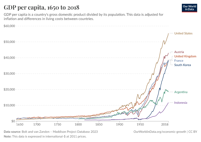 Bolt and van Zanden – Maddison Project Database 2023 – with minor processing by Our World in Data. “GDP per capita – Maddison Project Database – Long-run data in constant international-$” [dataset]. Bolt and van Zanden, “Maddison Project Database 2023” [original data]. Retrieved January 6, 2026 from https://sophia-test-2.owid.pages.dev/grapher/gdp-per-capita-maddison-project-database