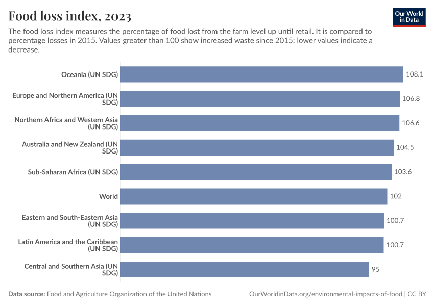 Food and Agriculture Organization of the United Nations – processed by Our World in Data. “Food loss index” [dataset]. Food and Agriculture Organization of the United Nations, “FAO” [original data]. Retrieved January 6, 2026 from https://sophia-test-2.owid.pages.dev/grapher/global-food-loss-index