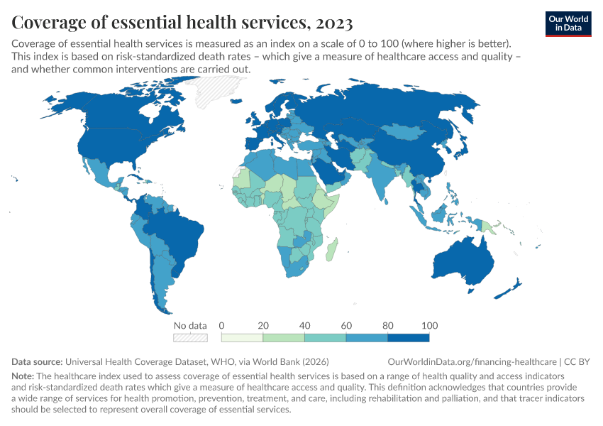 “Data Page: Coverage of essential health services”. Our World in Data (2026). Data adapted from World Health Organization (WHO) Global Health Observatory, via World Bank. Retrieved from https://sophia-test-2.owid.pages.dev/grapher/healthcare-access-quality-un [online resource]How to cite this data